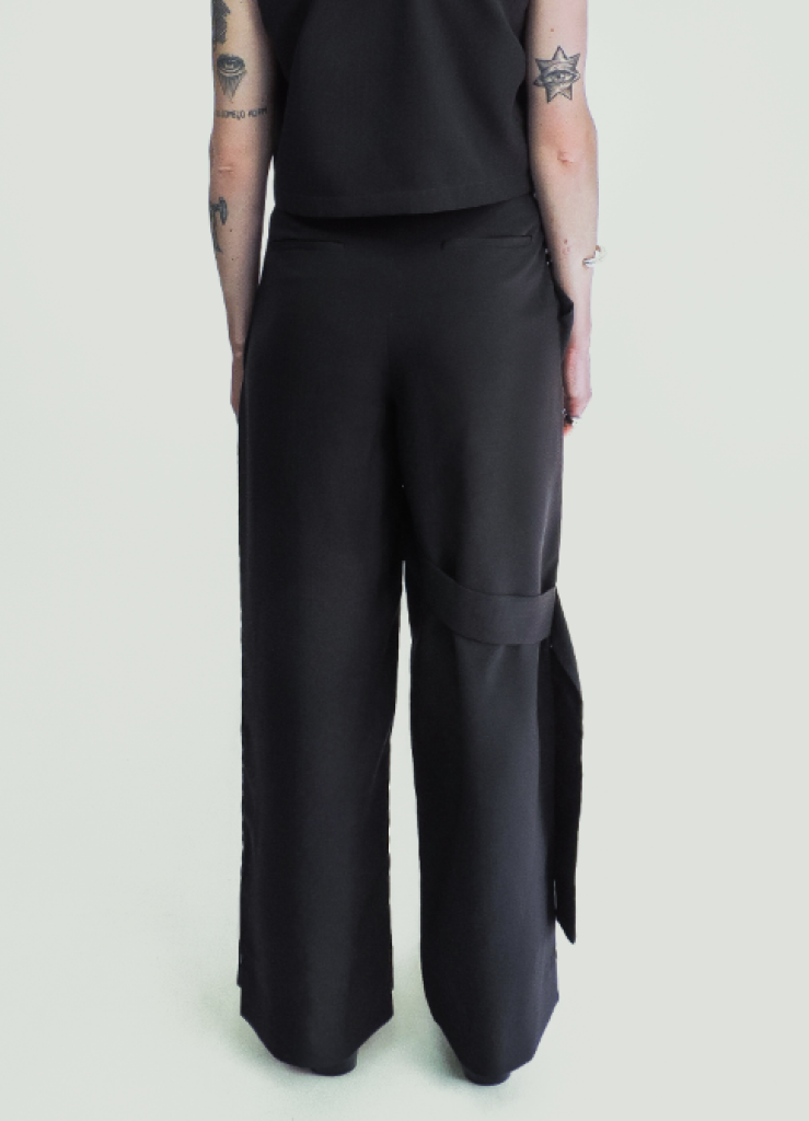 Calça com modelagem reta e detalhes no design assimétrico com faixas soltas, que conferem movimento e modernidade à peça. A peça possui caimento firme e toque acetinado, com bolsos laterais e traseiros.