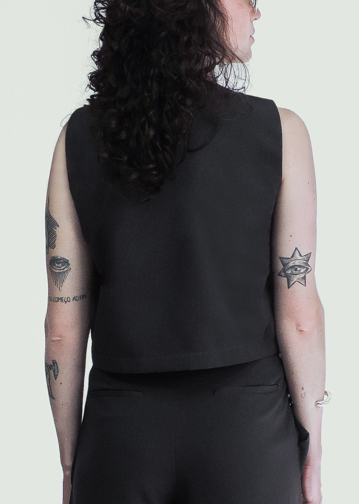 O colete possui design com linhas limpas e cortes que trazem atitude e sofisticação. Possui toque acetinado, caimento estruturado e modelagem levemente ampla, com abertura frontal e fecho com botão oculto.